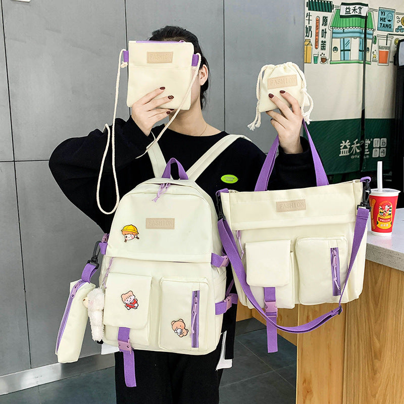 College Students' Backpack Five-piece Contrast Color Canvas School Bag