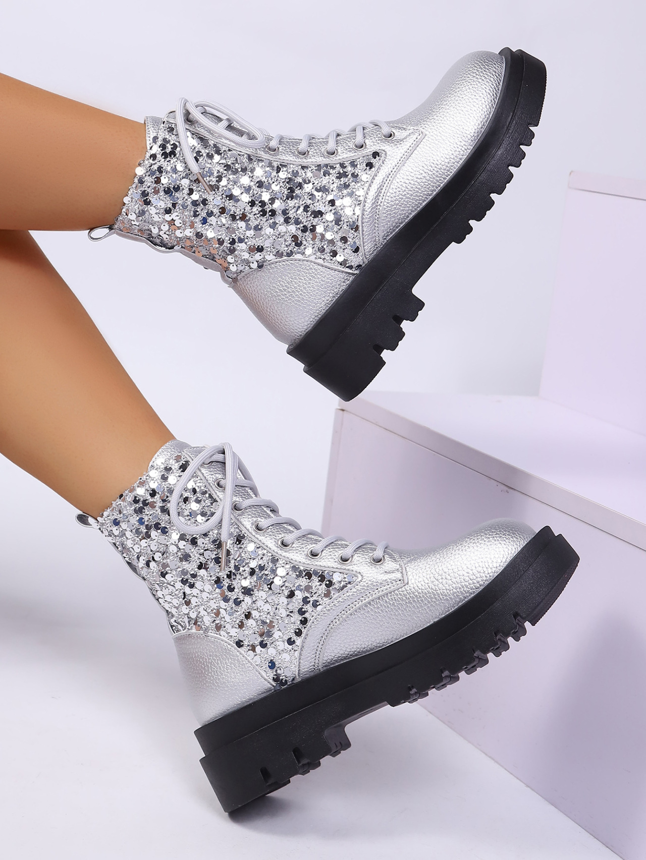 Leather Martin Boots Round Head Thick Bottom - PU Sequin Silver Gun Color Women's Boots Size 36-43