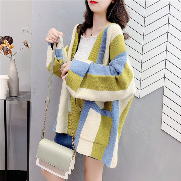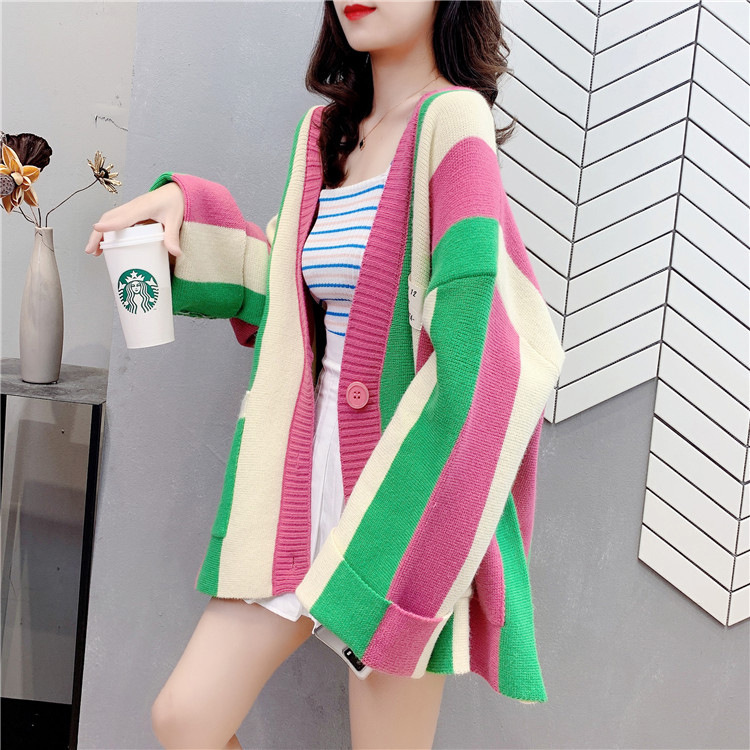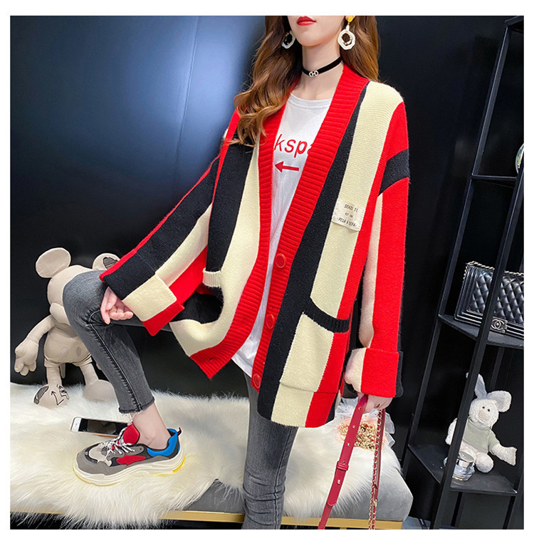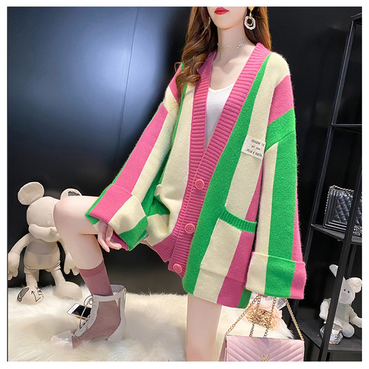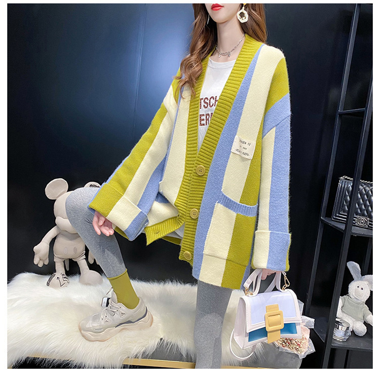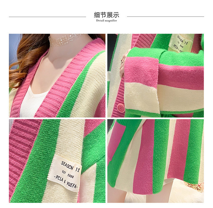 Striped Color Stitching Knitted Cardigan Sweater Coat For Women