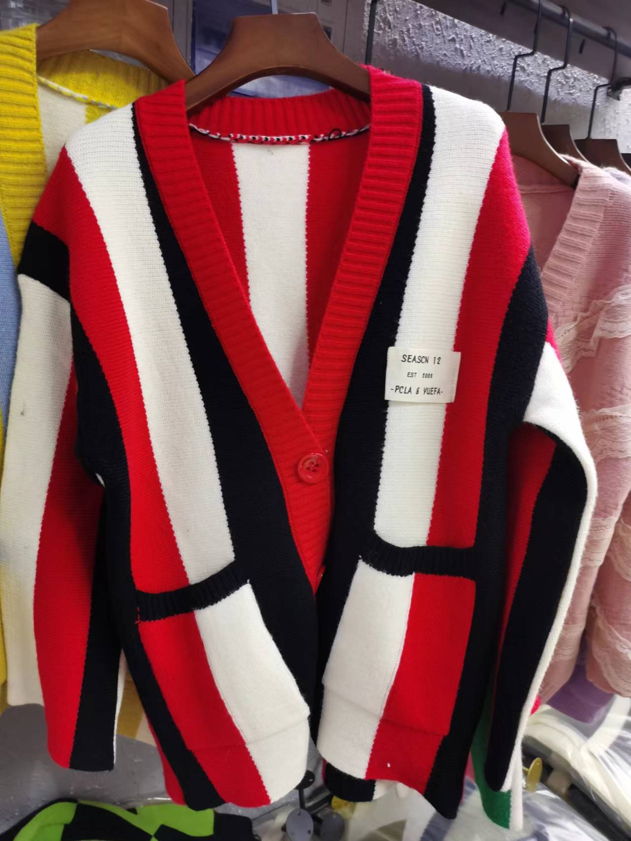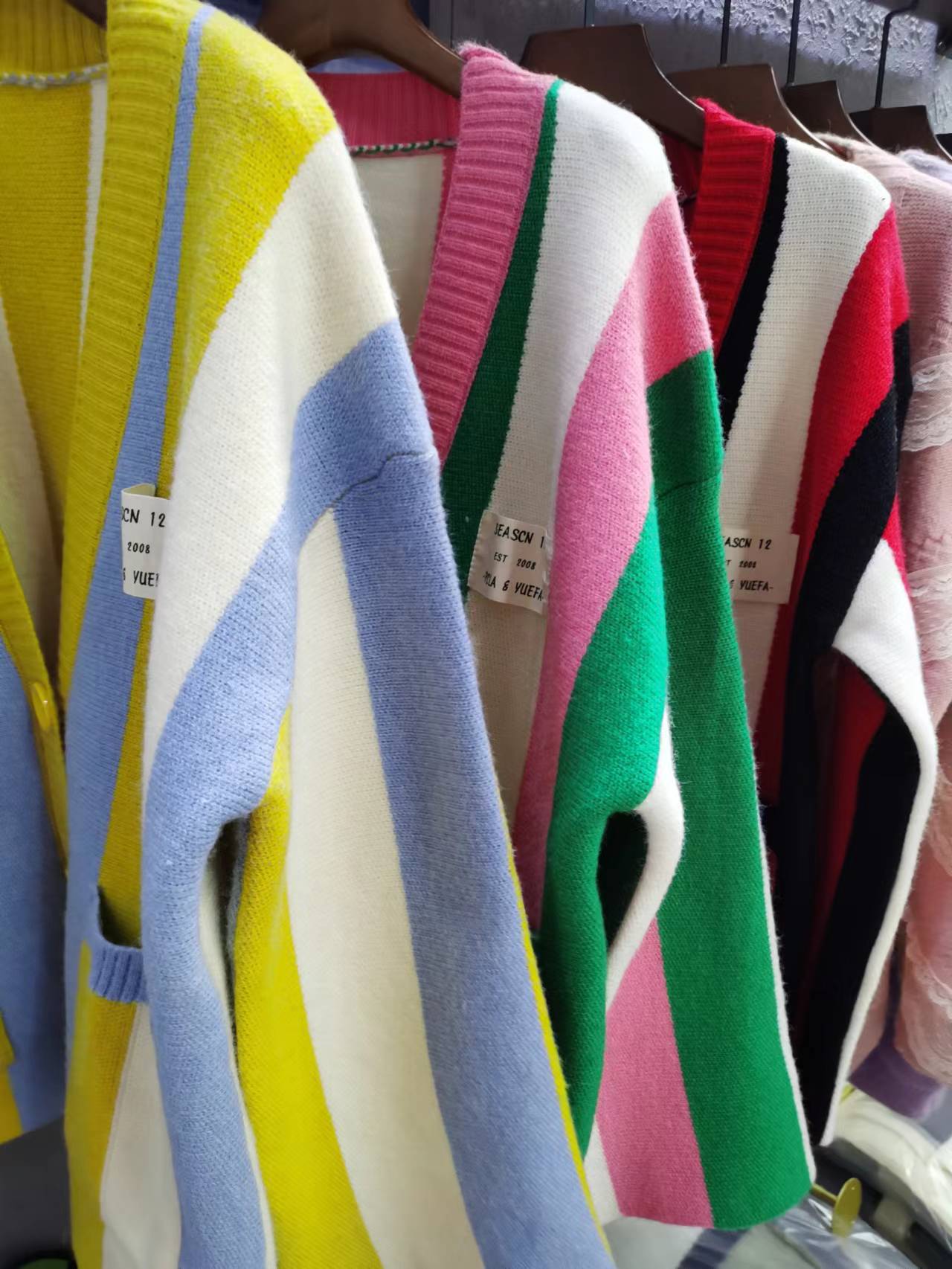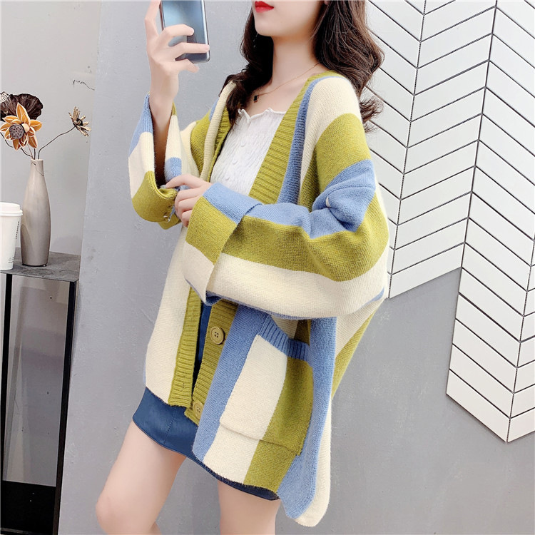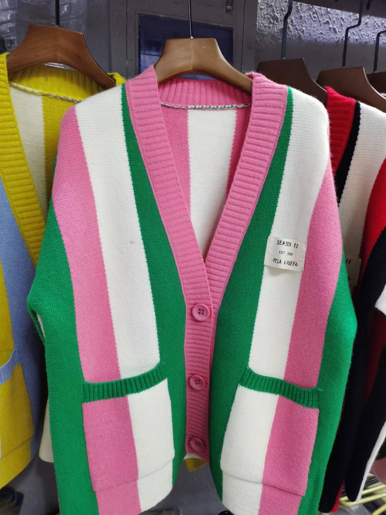 Striped Color Stitching Knitted Cardigan Sweater Coat For Women