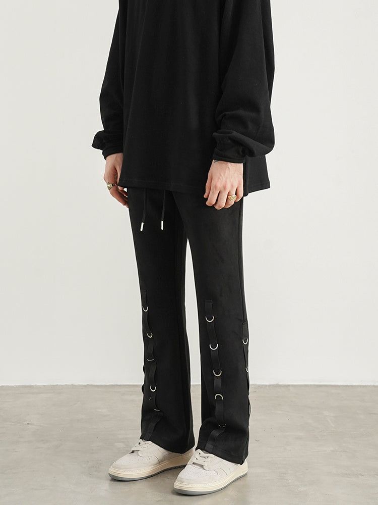 Suede Leather Hoop Embellished Micro-flared Trousers