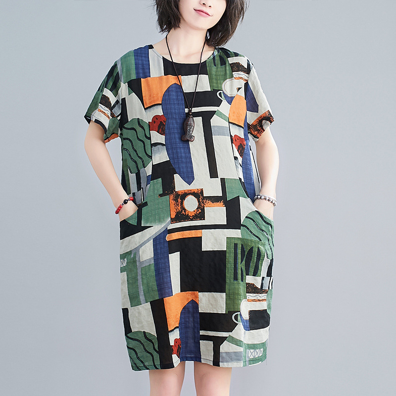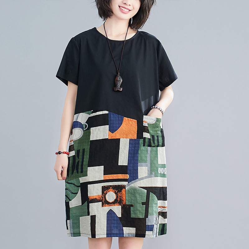 Summer Large Size Loose And Thin Stitching Printed Mid Length Dress
