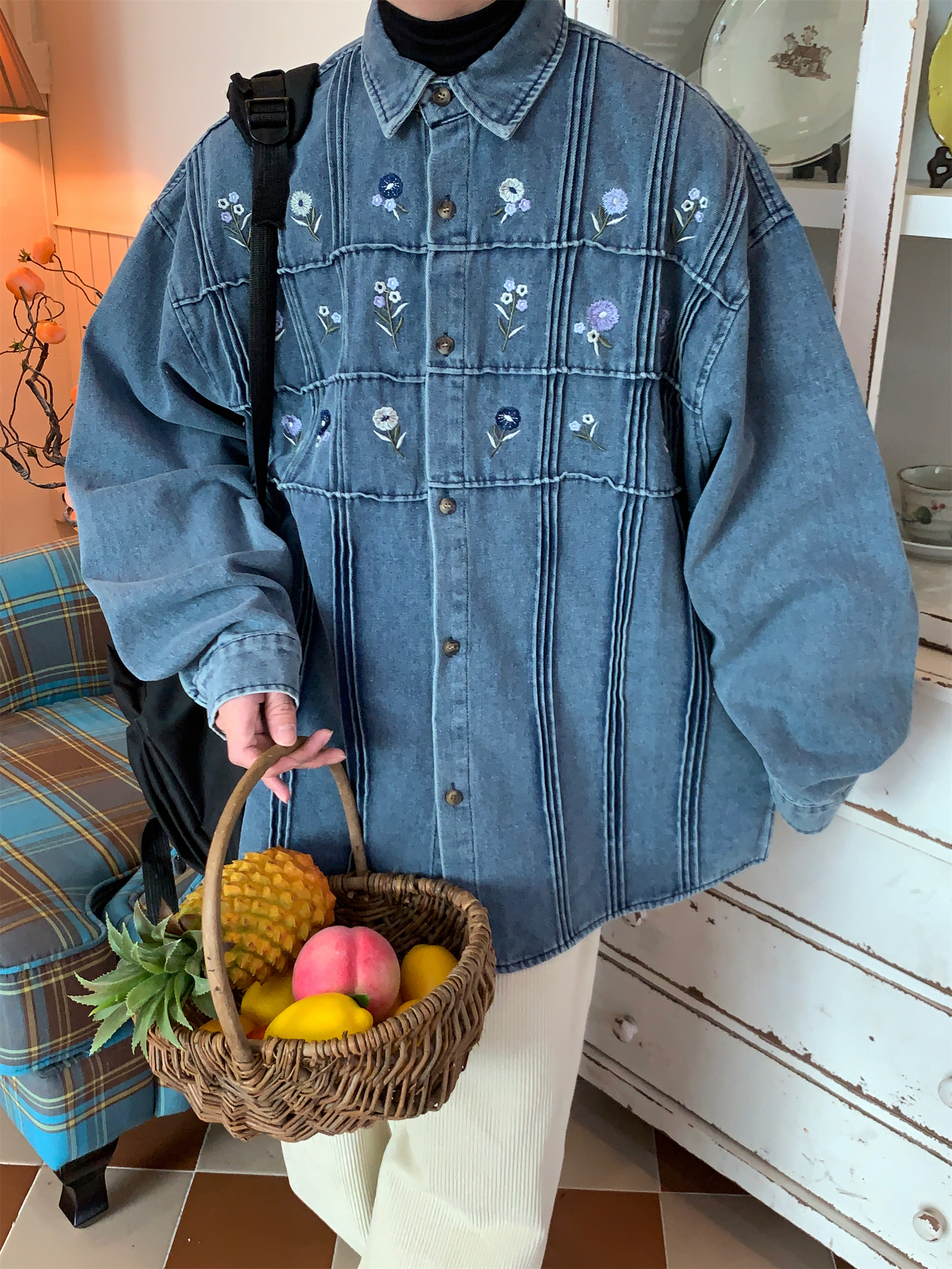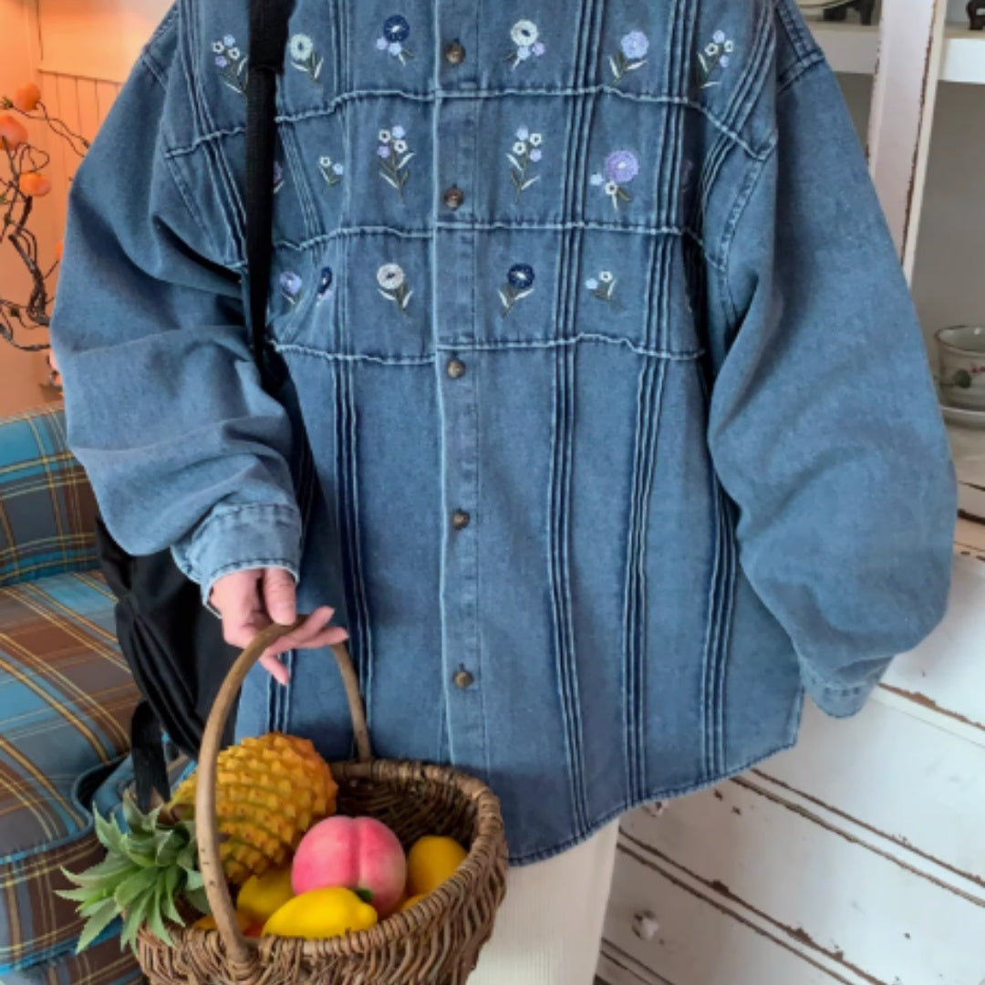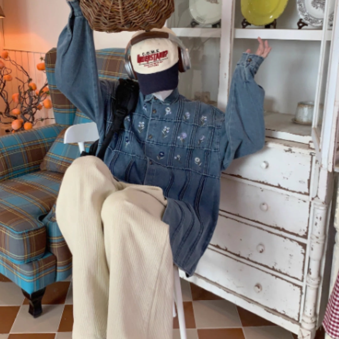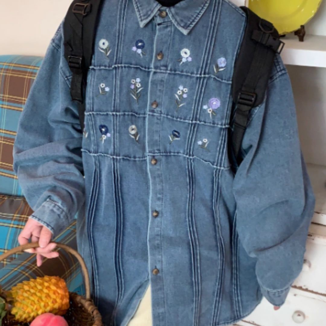 Vintage Small Floral Pleated Washed Denim Long Sleeved Shirt