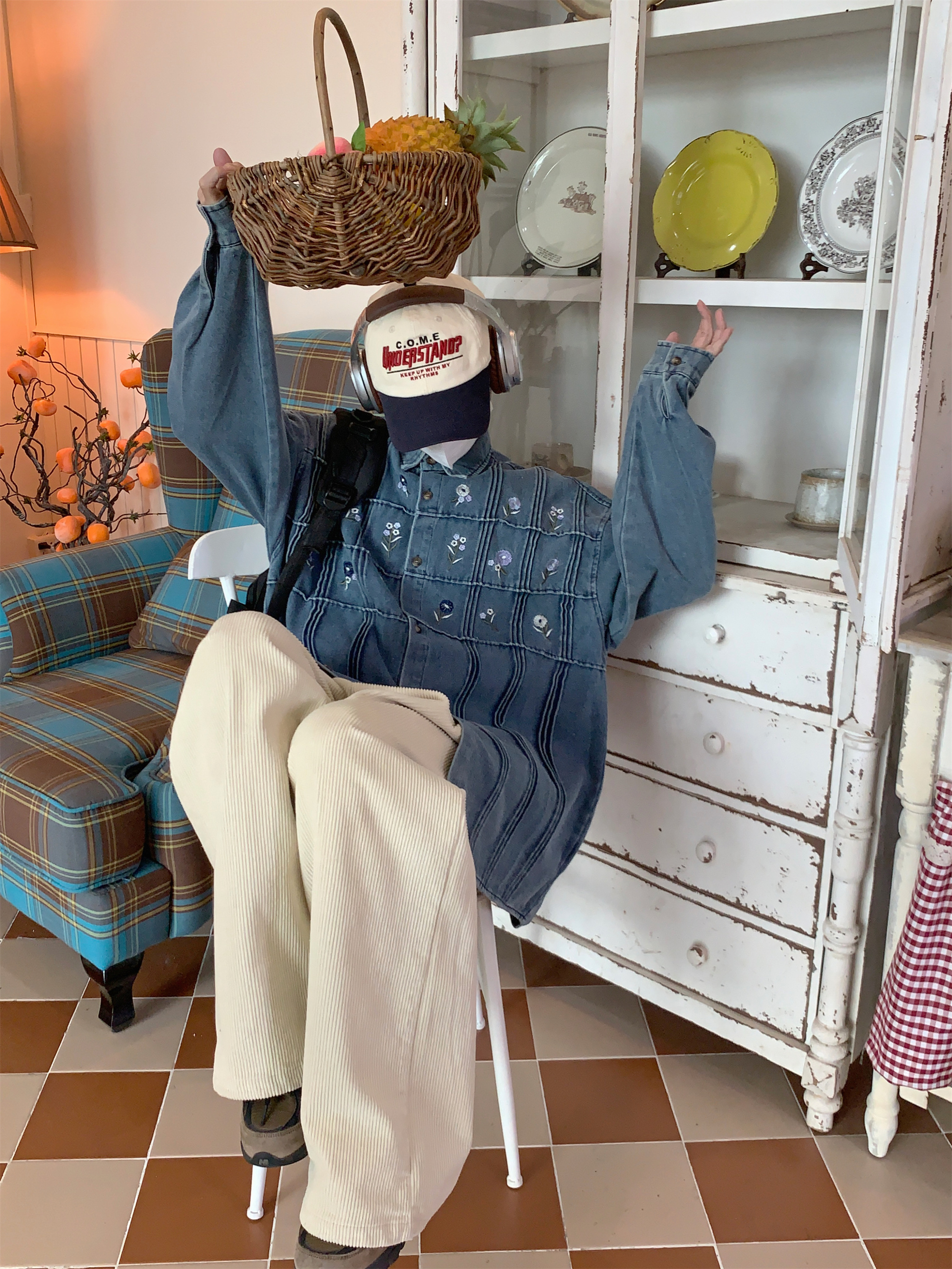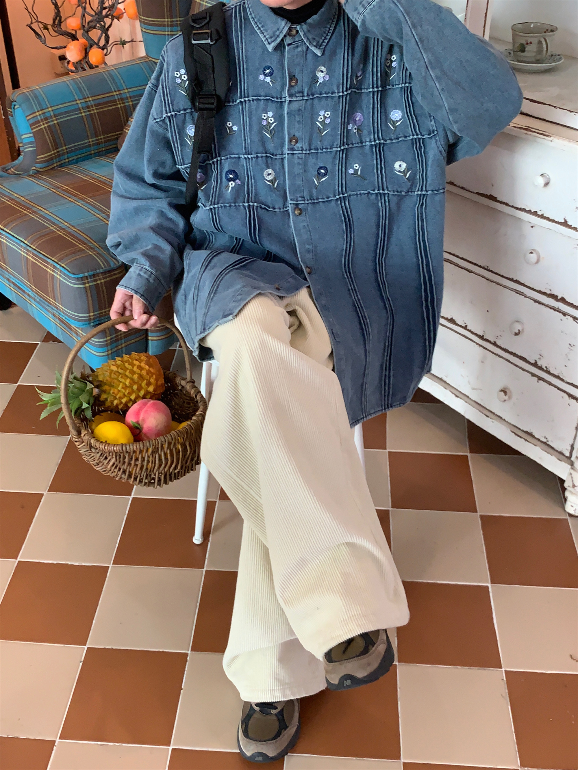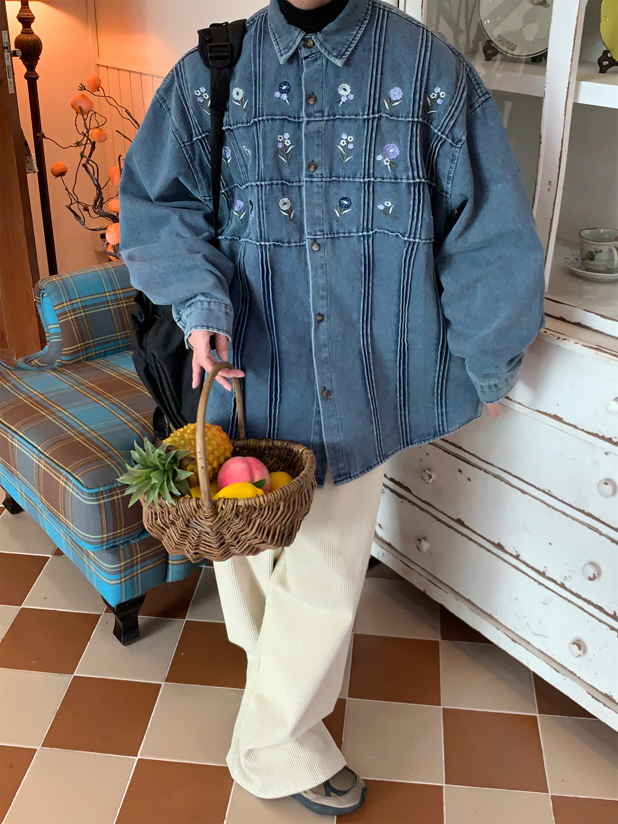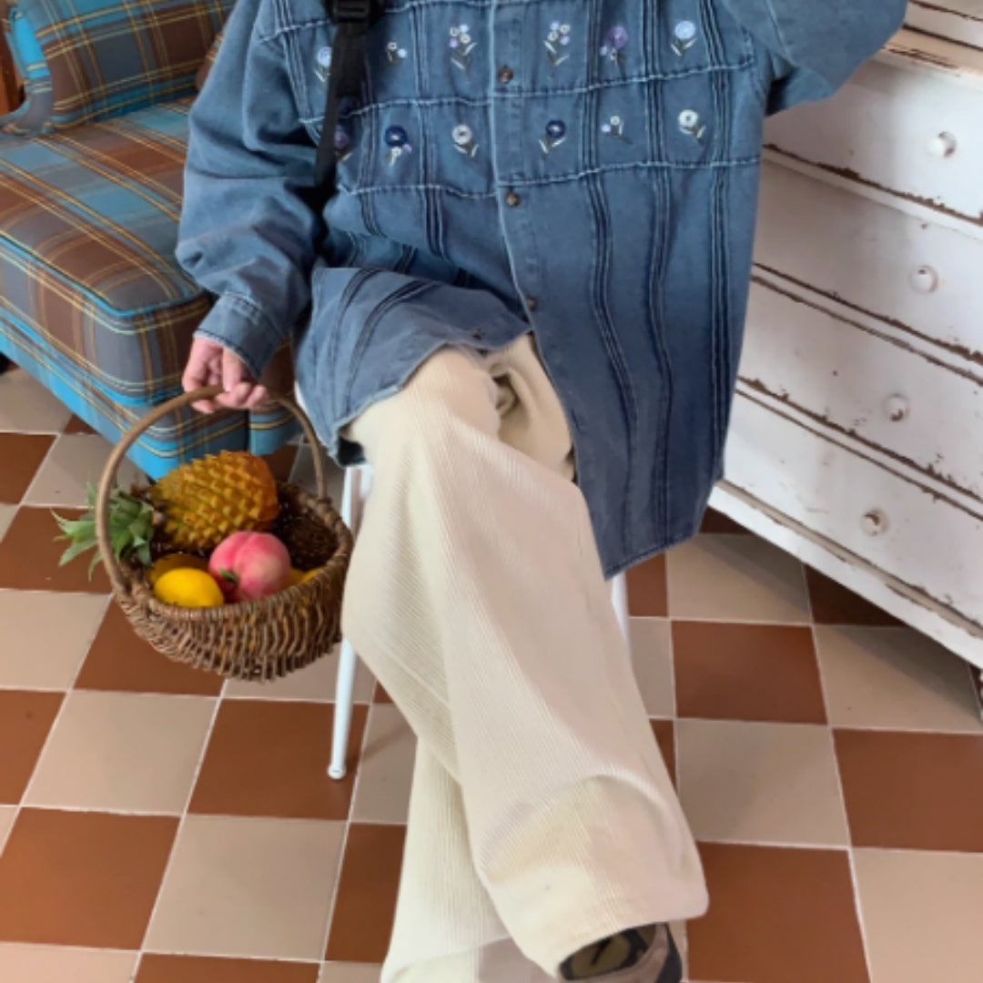 Vintage Small Floral Pleated Washed Denim Long Sleeved Shirt