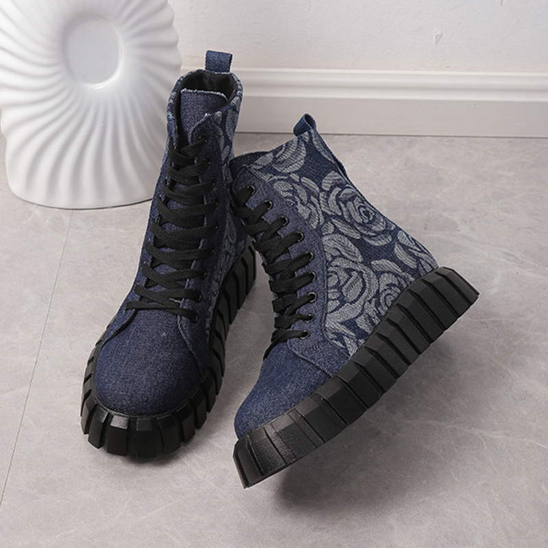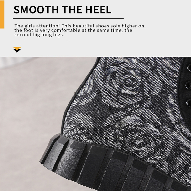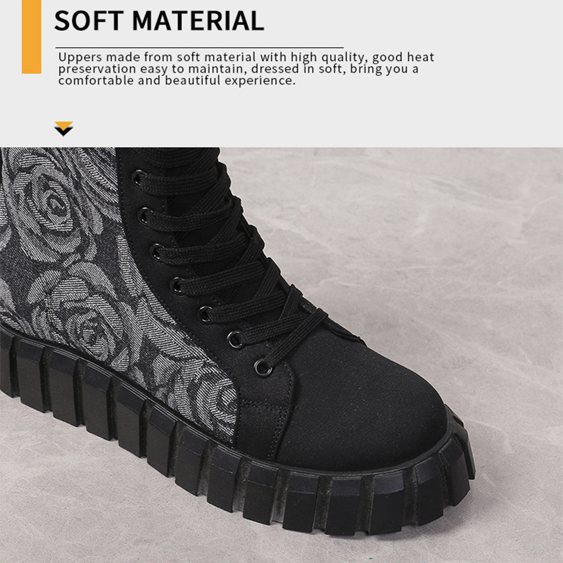 Women's Ankle Boots Floral Rose Pattern Platform Shoes Round Toe Lace-up Casual Boots Winter Flat Short Boot