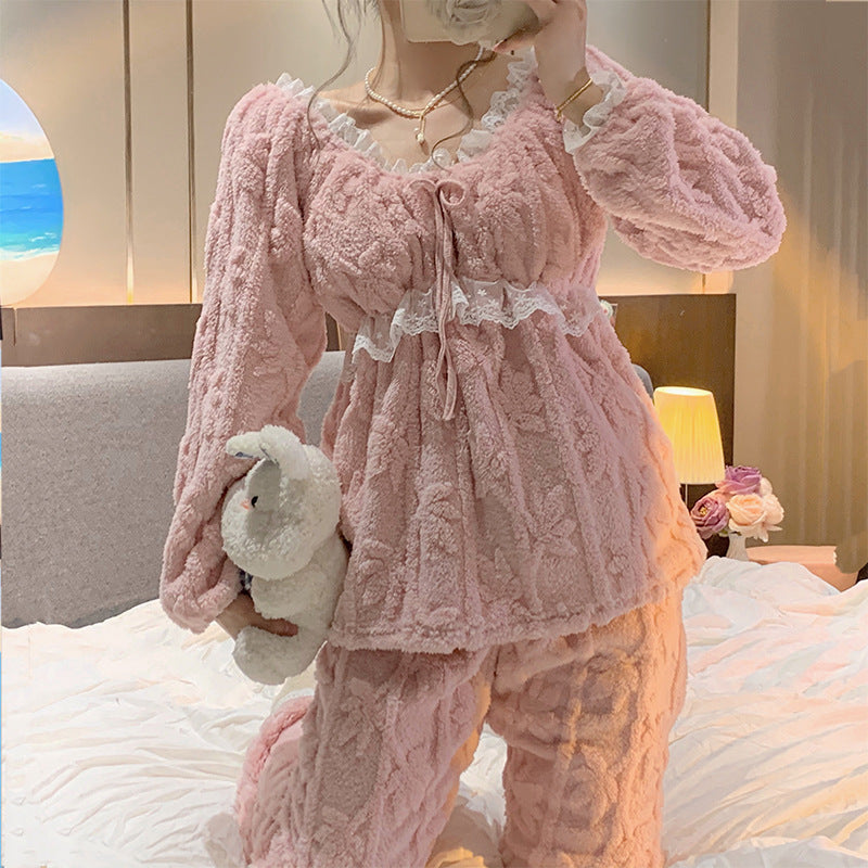 Women's Fashionable Flannel Lace Court Pajamas Suit